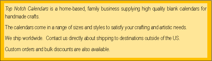 Our calendars are professionally printed on sturdy white cardstock. The ink will not bleed or smear when wet, making them suitable for many artistic uses, including rubber stamping, block printing, water coloring, photography, embossing, chalks, and pastels. |