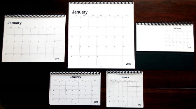 PIctured below, clockwise from the top left, are large rectangular, large square, desk, small square and small rectangular calendars. We also sell perpetual calendars in each of these styles and sizes. |